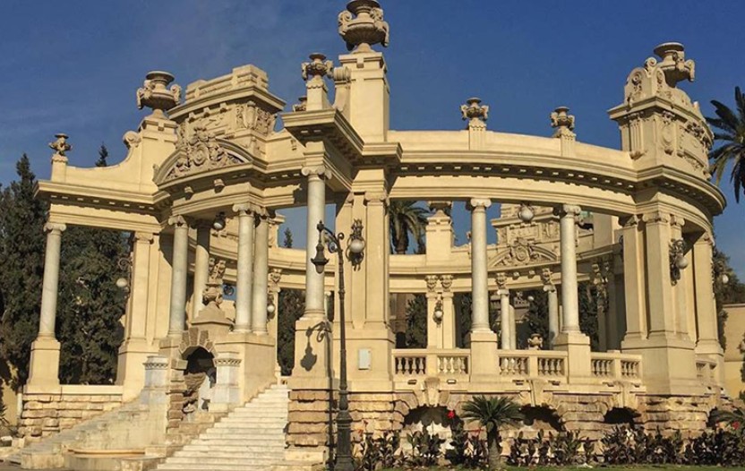 Jardines amplios, fuentes y caminos arbolados que rodean el edificio, aunque gran parte del espacio fue posteriormente absorbido por la expansión urbana de El Cairo.