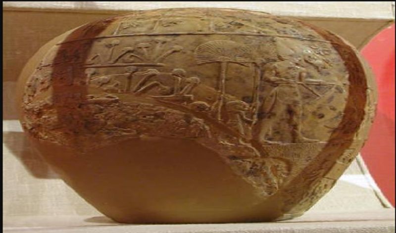 También en uno de los vasos dedicados por él en Hieracómpolis se ve acompañado del halcón Horus, que se simboliza la realeza egipcia.